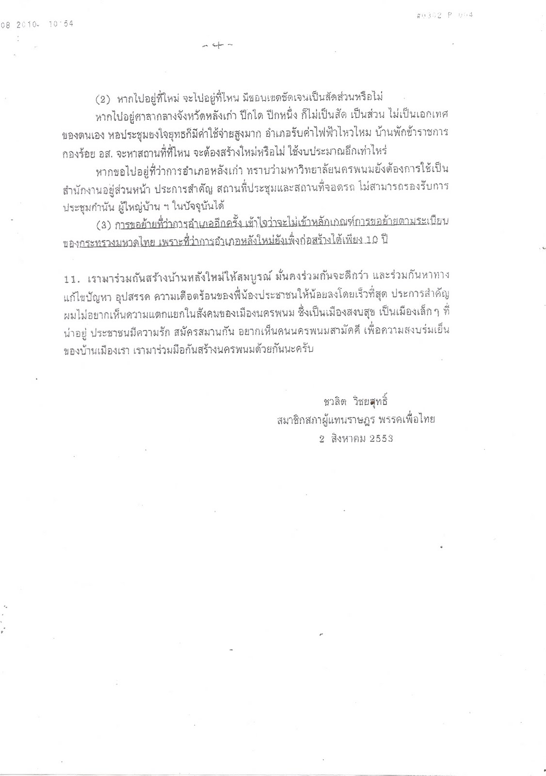 หนังสือฉบับนี้ ก็บอกชัดเจนว่า ทางอำเภอเมืองไม่ได้ขออนุญาตใช้พื้นที่อ่างเก็บน้ำหนองญาติ เพื่อก่อสร้างที่ว่าการอำเภอเมืองหลังใหม่ กับชลประทานนครพนม เนื่องจากชลประทานได้โอน " หนองญาติ " ให้ องค์การบริหารส่วนตำบลหนองญาติ ( ขณะนั้น ) เป็นผู้ดูแลแทนไปแล้ว เมื่อ วันที่ 15 ตุลาคม 2540